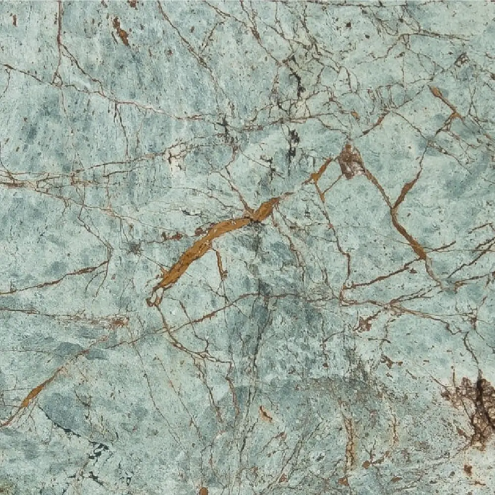 Turquoise Granite is a striking natural stone distinguished by its vibrant blue-green base color, reminiscent of the gemstone turquoise. This lively hue is interspersed with elegant white and golden rusty brown veins, creating dramatic movement and a vivid visual effect. It is quarried from the mountainous regions of Khorasan, near Mashhad, Iran.